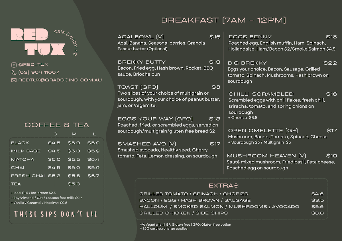 Welcome to Red Tux Cafe, a delightful gem located at 476 St Kilda Rd, Melbourne. Renowned for its cozy atmosphere and exceptional service, this cafe offers an enticing menu that caters to all tastes. Start your day with a vibrant Acai Bowl, or indulge in the classic Eggs Benny for a rich breakfast experience. The Big Brekky is a hearty favorite, showcasing the best of breakfast possibilities on sourdough.